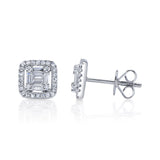 Radiating modern elegance, these 3/8ctw diamond stud earrings are exquisitely crafted in luminous 14k white gold. A striking arrangement of baguette-cut diamonds forms the center, framed by a shimmering halo of brilliant round diamonds for added sparkle and depth. Their chic, squared silhouette offers a refined twist on a timeless classic, perfect for elevating both day and evening looks. Sophisticated yet radiant, they are a captivating staple for any jewelry collection.