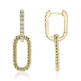 These 1/3ctw Diamond 14k Yellow Gold Earrings bring together modern radiance and timeless craftsmanship. Each earring features a sleek diamond-encrusted hoop gracefully linked to a twisted oval drop, creating an elegant interplay of texture and sparkle. The brilliant round diamonds catch the light with every movement, while the warm glow of 14k yellow gold adds a luxurious touch. Perfect for elevating any ensemble, these earrings embody refined sophistication and effortless glamour.
