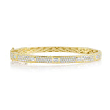 Radiating brilliance from every angle, this 14k yellow gold emerald pavé bangle dazzles with 1 3/4ctw of luminous diamonds. Rows of finely set round diamonds create a glittering foundation, beautifully accented by striking emerald-cut diamonds that add depth and sophistication. The intricate lattice design on the inner band enhances both comfort and craftsmanship, reflecting attention to every luxurious detail. Elegant and timeless, this bangle is a true celebration of modern glamour and refined artistry.